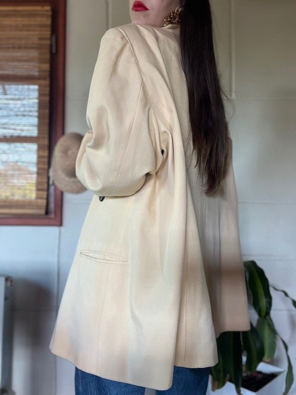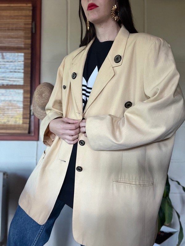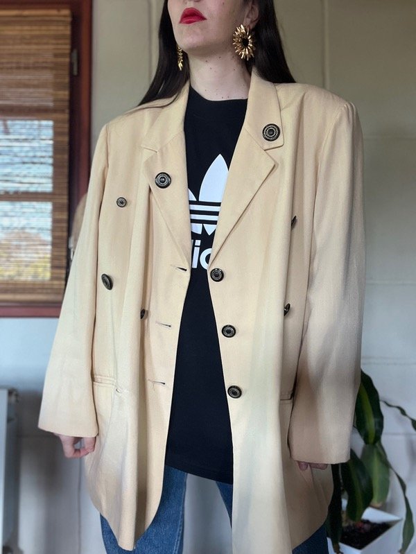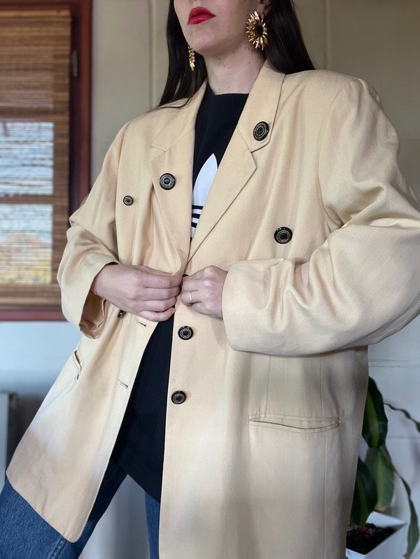 Blazer con botones vintages colocados en diferentes lugares, es de tela importada suave y liviana. Todo forrado en su interior. Queda bien Oversize, un comodín q no te puede faltar. El color es hermoso. Talle M. Medidas: h a h 55 cm/ Sisa 54 cm/ Largo 80 cm. Muy buen estado.