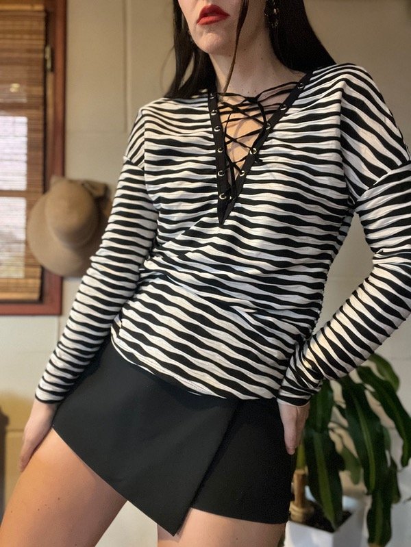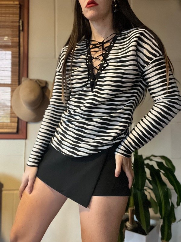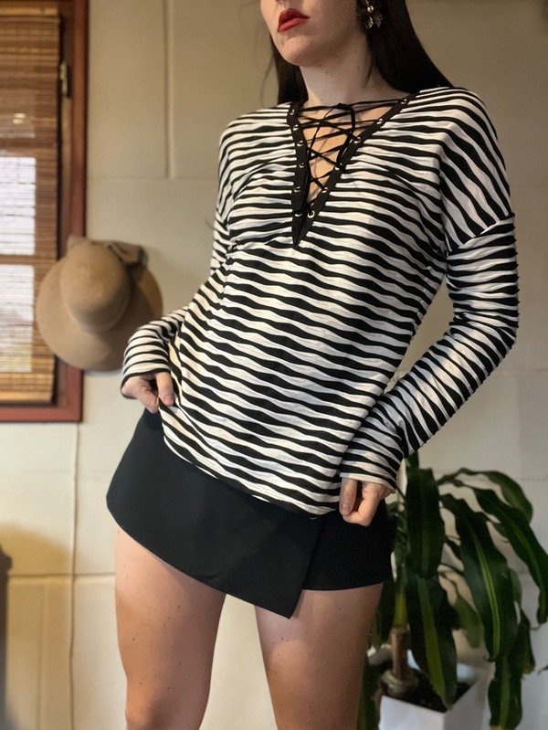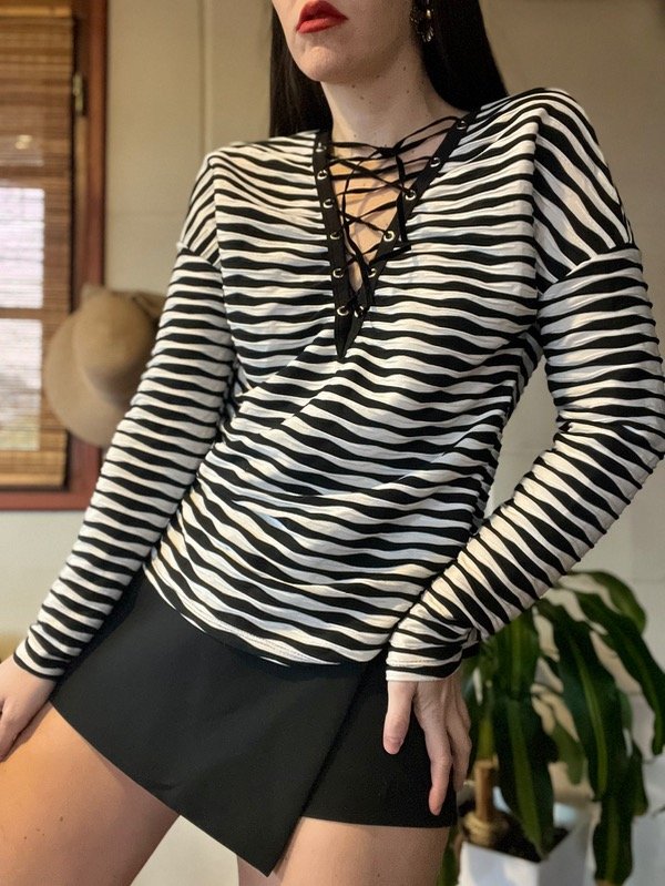 Remera rayadita acordonada en parte delantera. La tela es muy linda y el calce también. Talle M. Medidas: h a h 55 cm/ Sisa 53 cm/ Largo 57 cm. Muy buen estado.