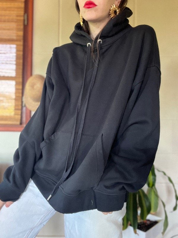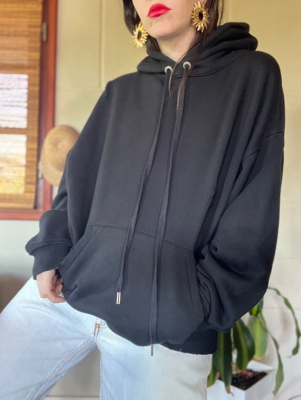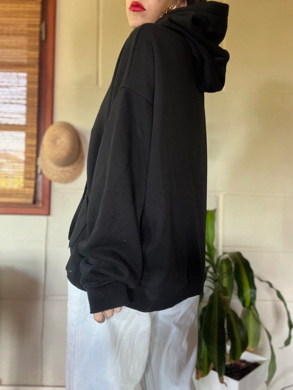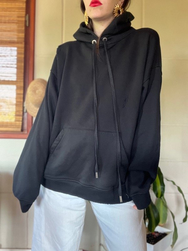 Buzo Oversize con roturas. Tiene cordones largos ajustables en capucha y bolsillo canguro. Frisado en su interior fino. Es una bomba clásica q no vas a dejar de usar. Buena caída y calce. Talle M. Medidas: h a h 67 cm/ sisa 65 cm/ Largo 65 cm. Estado: Nuevo.