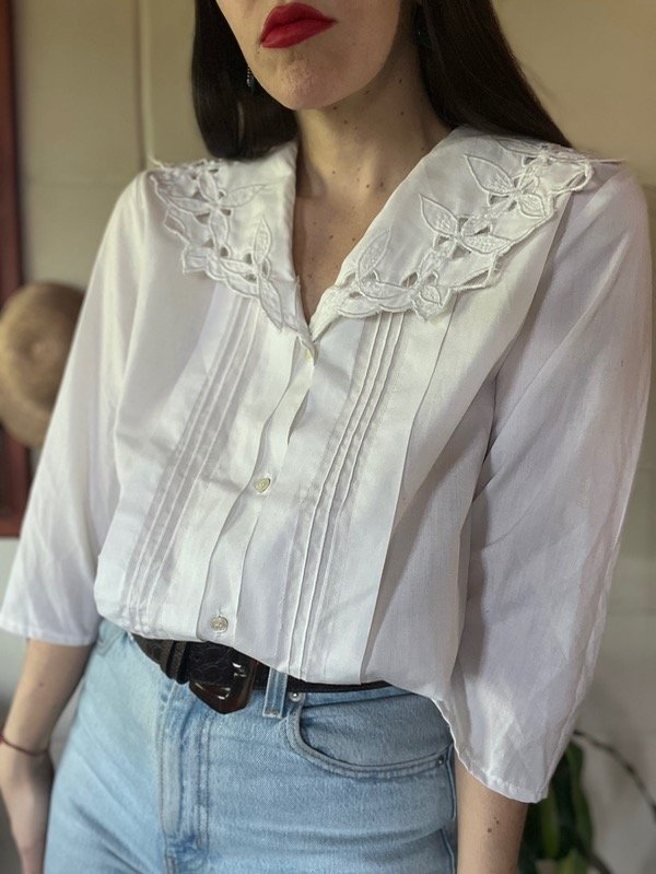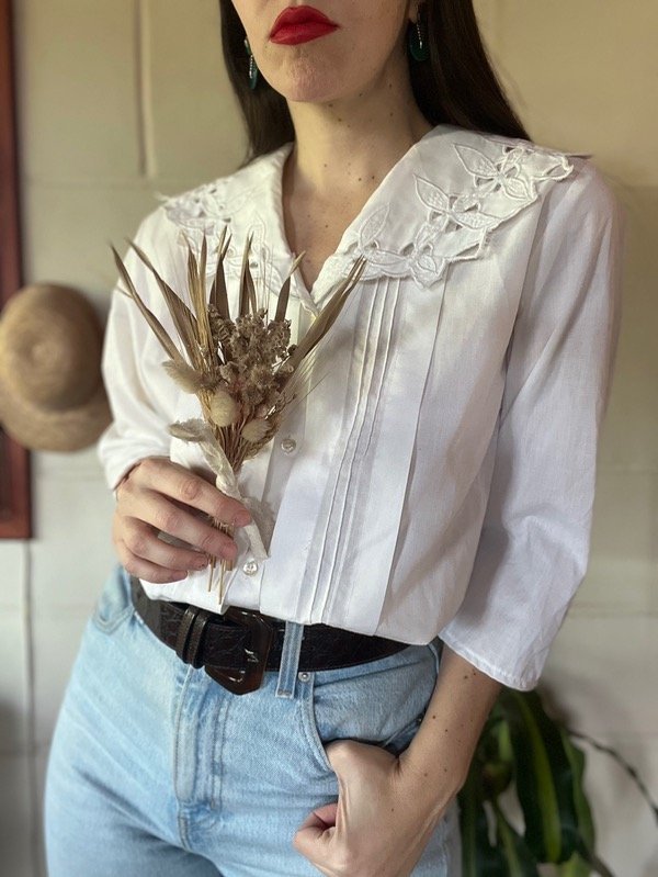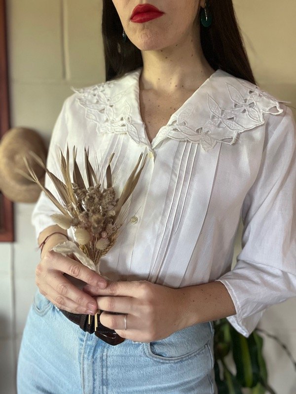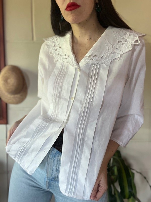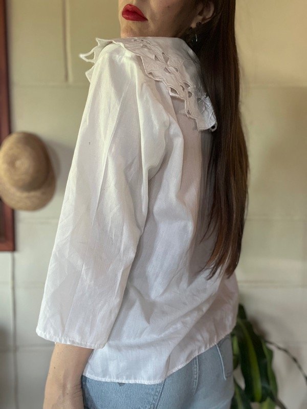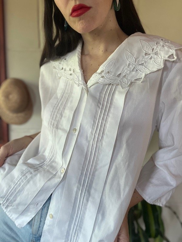 Camisa Bordada. El cuello es todo. Una hermosura bordada, con tablitas delanteras, mangas 3/4. Tela suave y liviana. Talle M. Medidas: h a h 52 cm/ Sisa 50 cm/ Largo 60 cm. Muy buen estado.