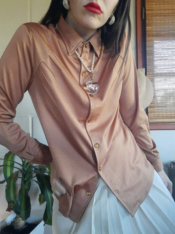 Camisa color Bronce. Es un clásico infaltable que va con todo. Con cuellito, botones y corte hermoso. Talle S/ M. Medidas: h a h 50 cm/ Sisa 48 cm/ Largo 58 cm. Muy buen estado.