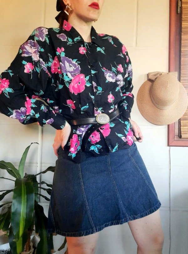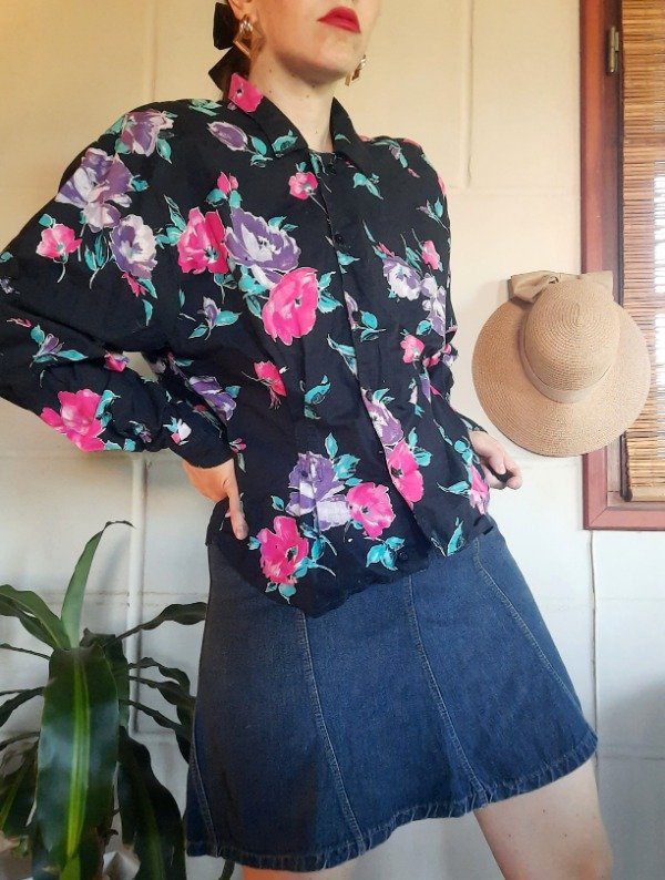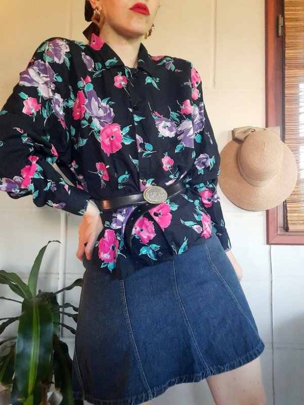 Camisa Floreada colores hermosos. " Historieta".Tela más bien Rígida. Con botoncitos transparentes cuellito. Tiene una mancha en puño pero parece parte de los pétalos de las rosas.Talle M. Medidas: h a h 52 cm/ Sisa 50 cm/ Largo 54 cm. Buen estado.