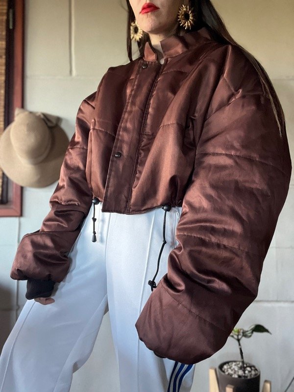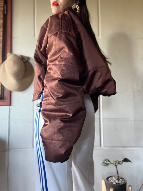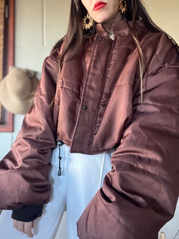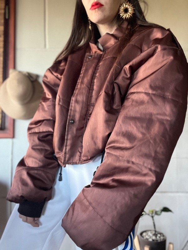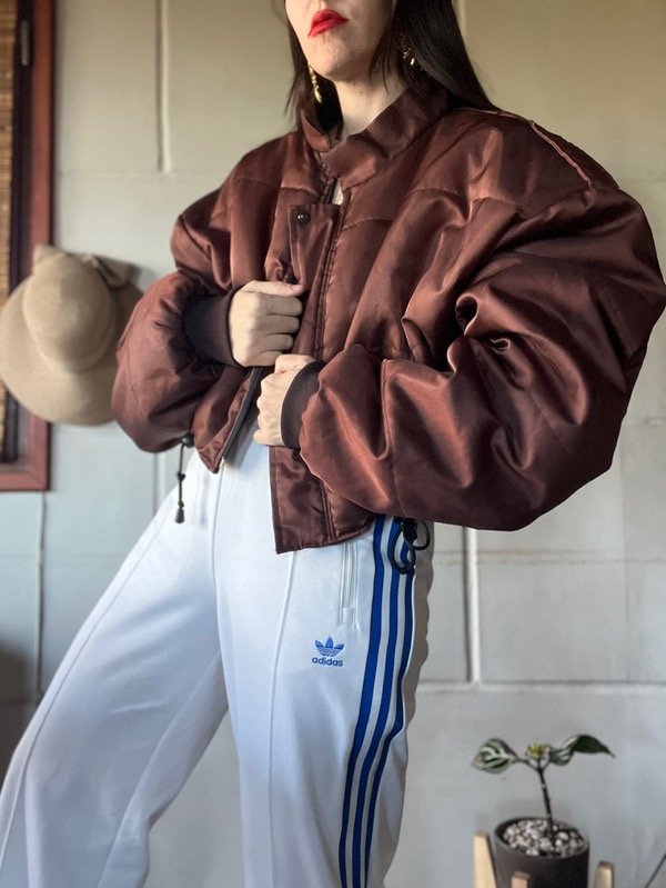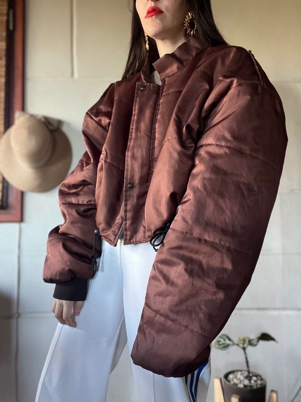 Campera Chocolate Oversize a la cintura. Es una bomba con mucha onda. Con cierre, cuellito mao, elástico en muñecas y broches. Tela liviana, acolchonada. Tiene algunas manchitas pero con el color no se notan. Talle M corte Oversize. Medidas: h a h 60 cm/ sisa 58 cm/ Largo 52 cm. Buen estado.