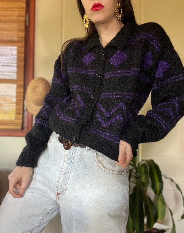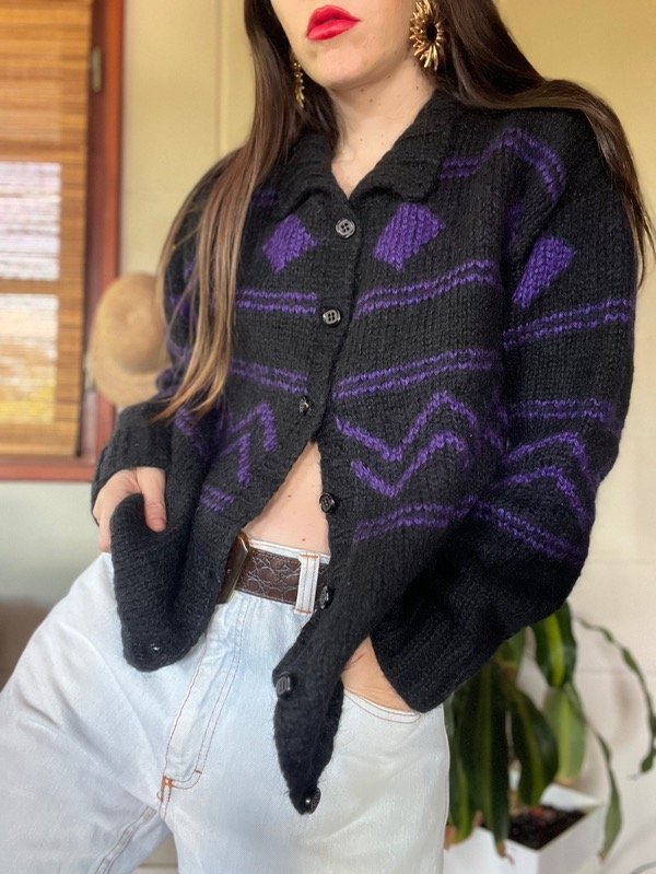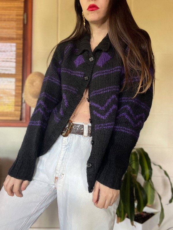 Cardigan de lana Violet. Es una belleza. Con cuellito tipo chomba y botones. Re abrigadito. Talle M. Medidas: h a h 57 cm/ Sisa 55 cm/ Largo 60 cm. Excelente estado.