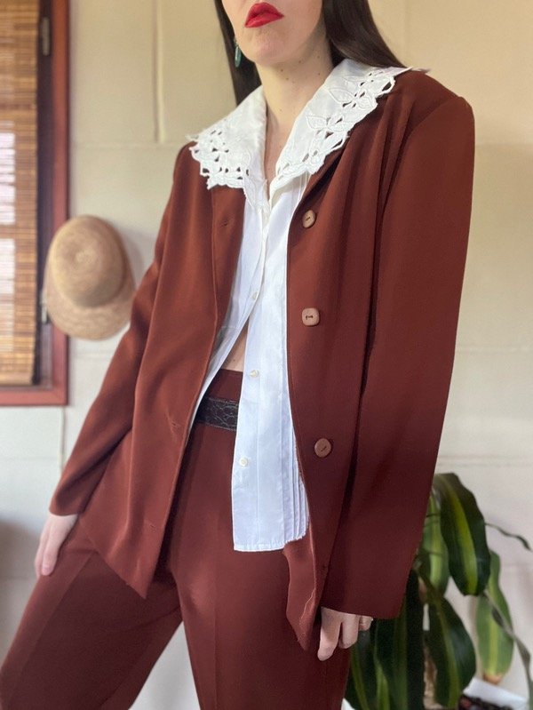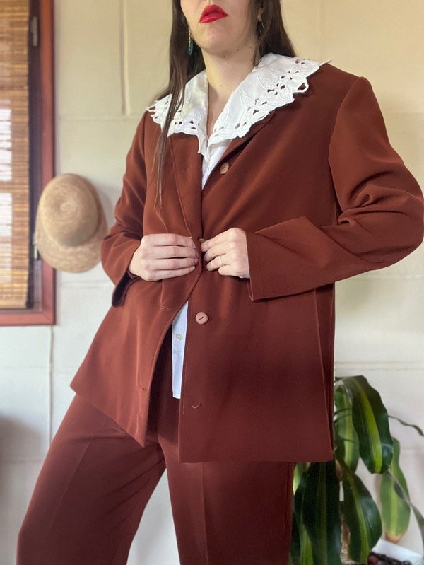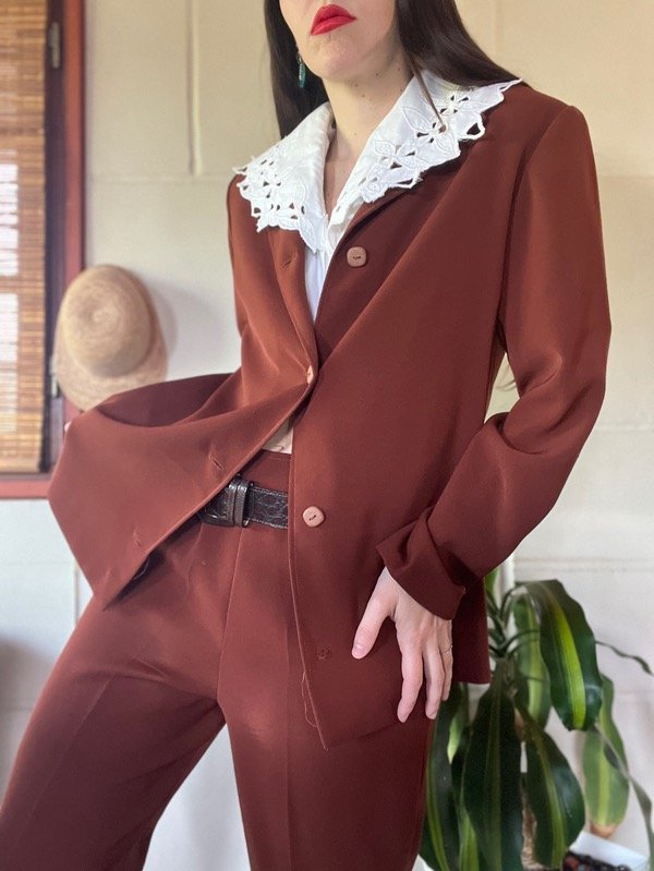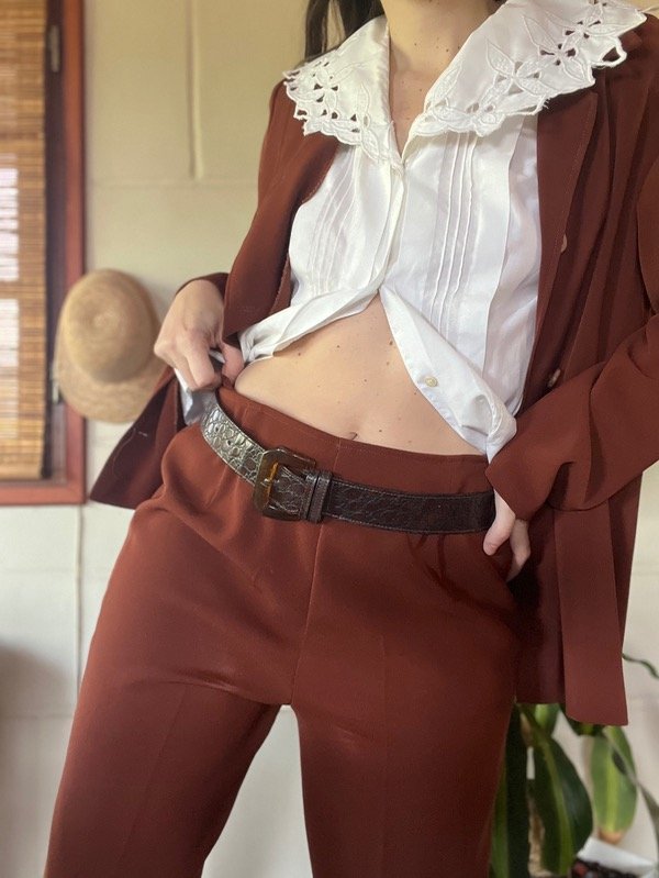 Conjunto chocolate. Es una hermosura para usar solo, con camisas, remeras o por separado. Tela hermosa y liviana. Camisa con botones. Talle M. Medidas: h a h 52 cm/ Sisa 50 cm/ Largo 67 cm. Pantalón con cierre trasero y pinzas. Talle 38/40. Medidas: Cintura 80 cm/ Cadera 110 cm/ largo 1,07 . Muy buen estado.