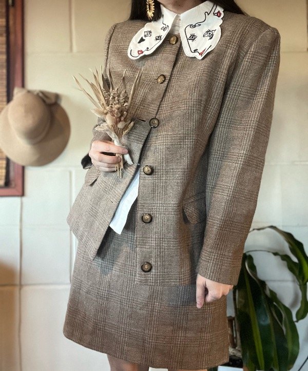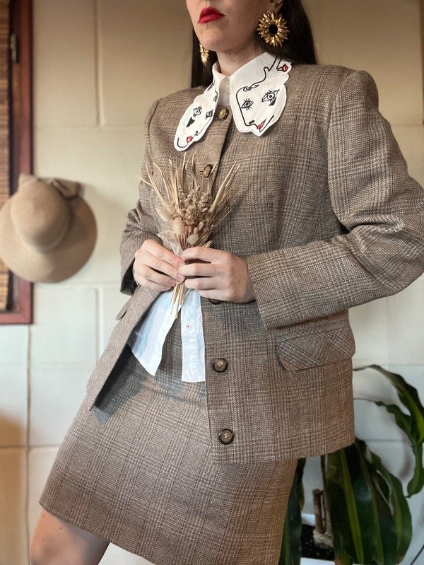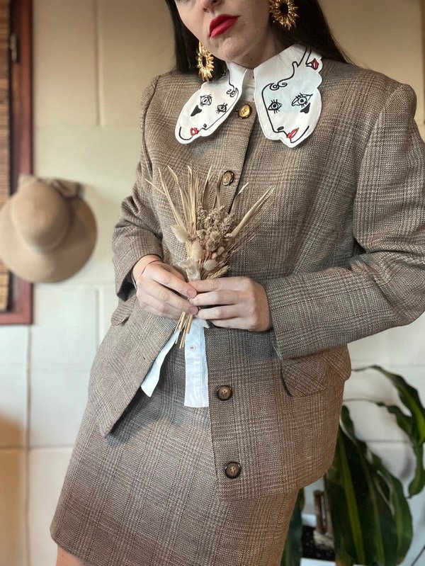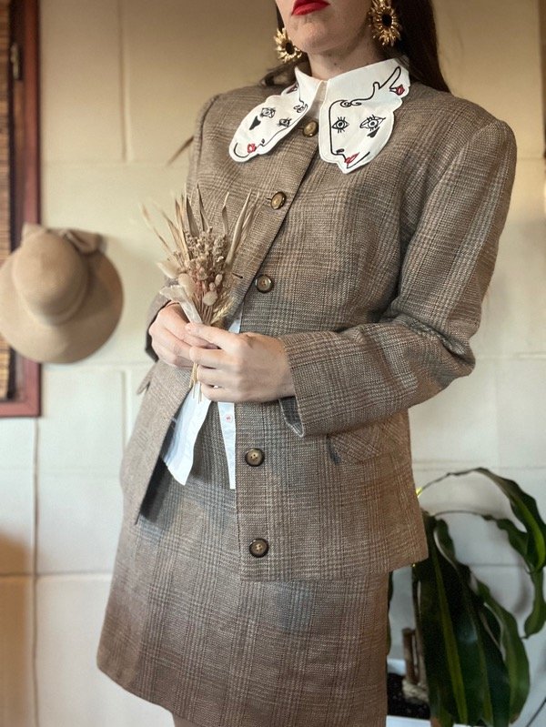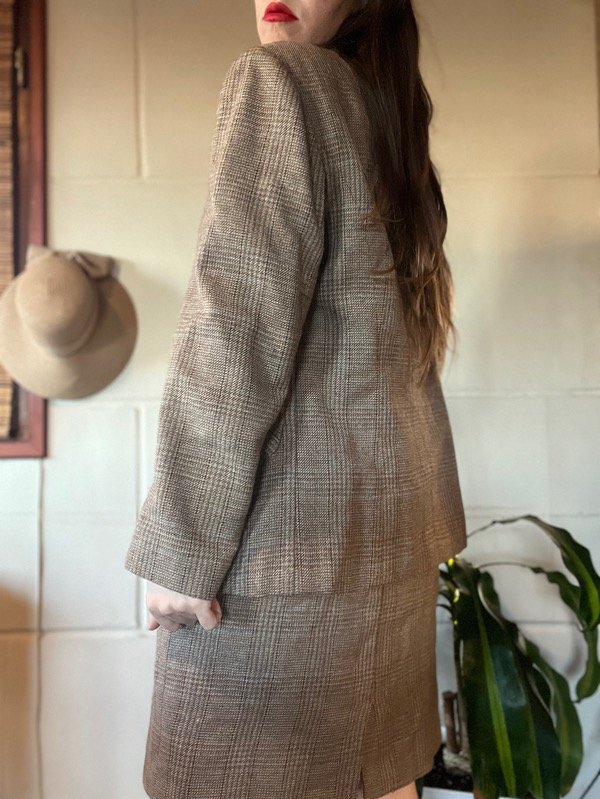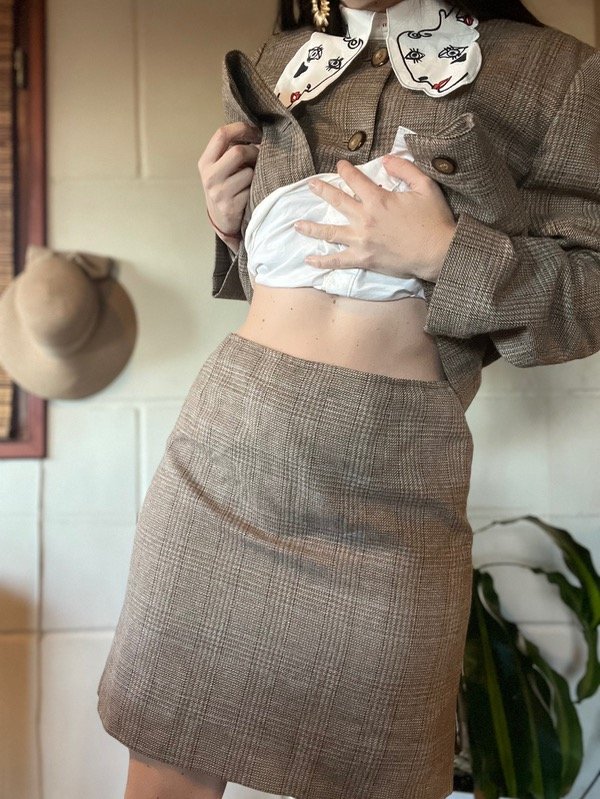 Conjunto Sastrero Cuadrille. Es hermoso. De tela abrigadita, todo forrado en su interior. Saco con botones, bolsillos y cuello redondo. Talle M: h a h 50 cm/ Sisa 48 cm/ Largo 67 cm. Falda tiro bajo o alto. Con cierre trasero. Talle 38/40. Medidas : Cintura 78 cm/ Cadera 102 cm/ Largo 49 cm. Muy buen estado.