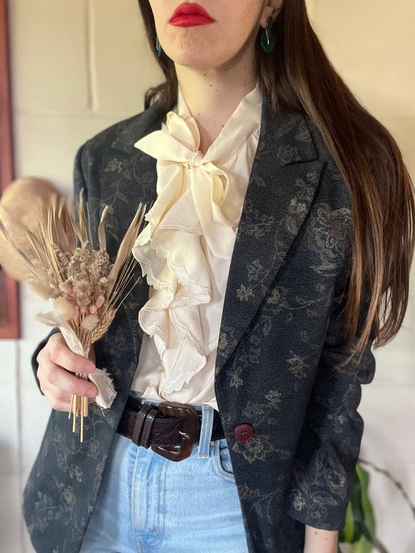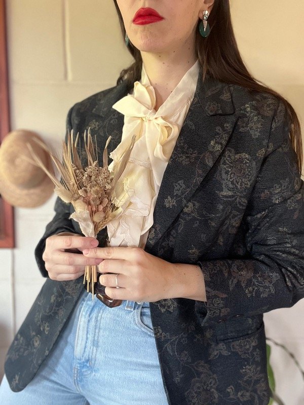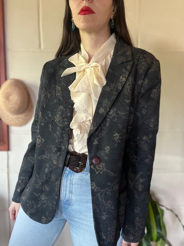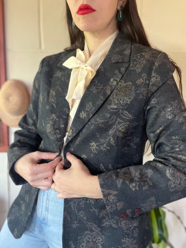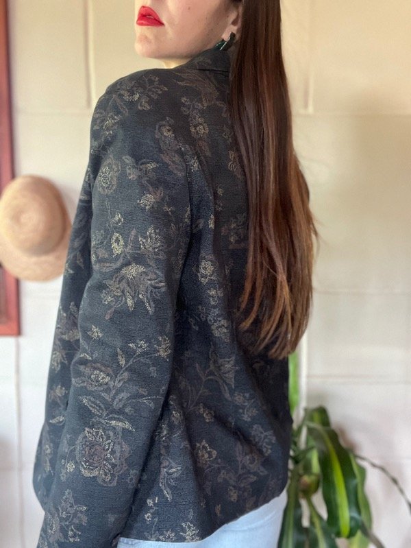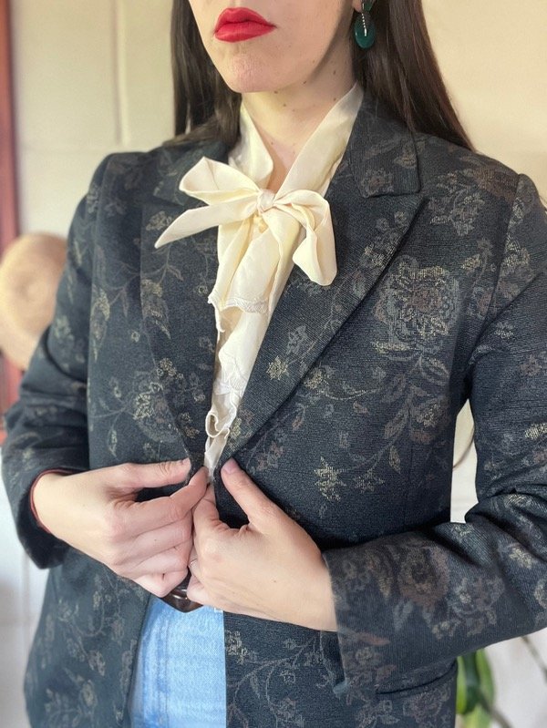 Saquito Berlín. Es una belleza. Estampado con flores. Botones y bolsillos. Todo forrado en su interior, liviano. Talle M. Medidas: h a h 50 cm/ Sisa 48 cm/ Largo 64 cm. Excelente estado.