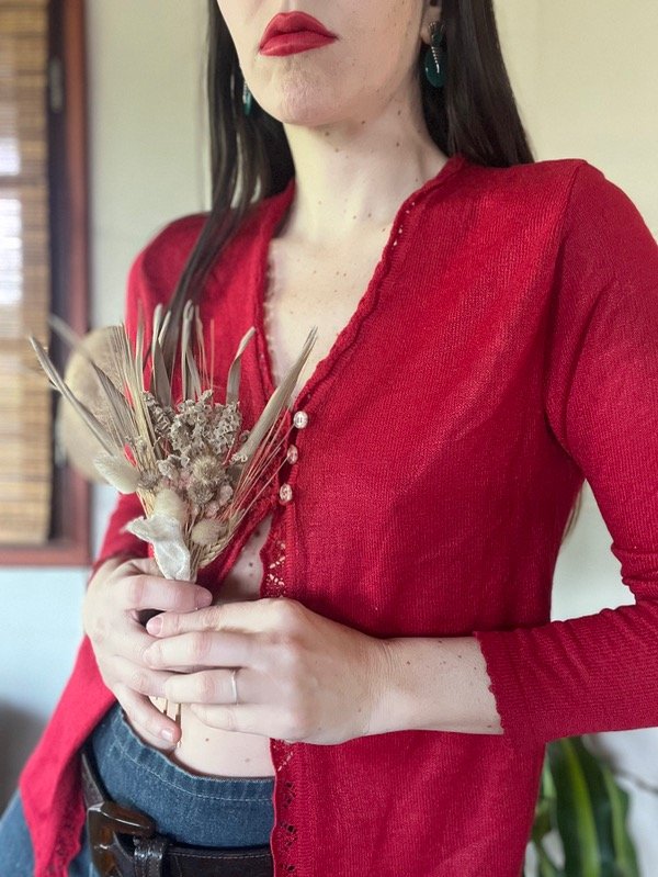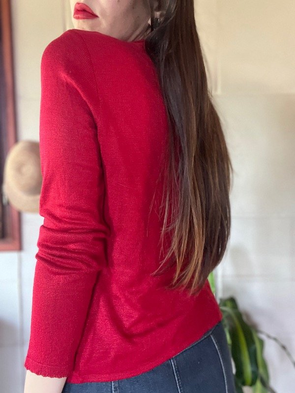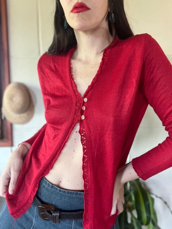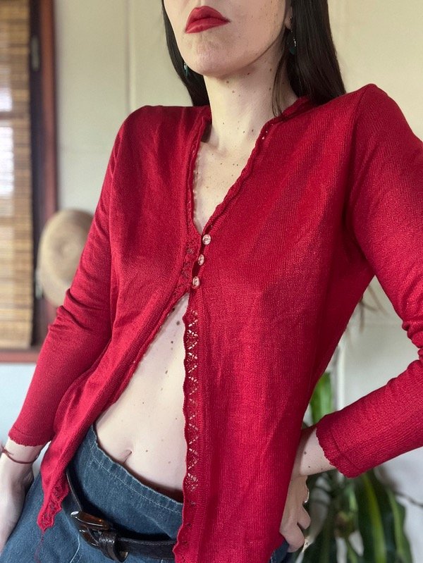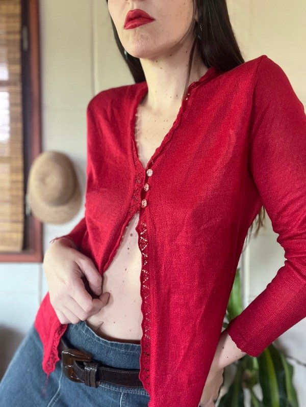 Saquito de hilo Colorado. Es una belleza, súper suave y liviano. Para usar abierto, queda hermoso y muy sexi. Talle M. Medidas: h a h 47 cm/ Sisa 46 cm/ Largo 60 cm. Excelente estado.
