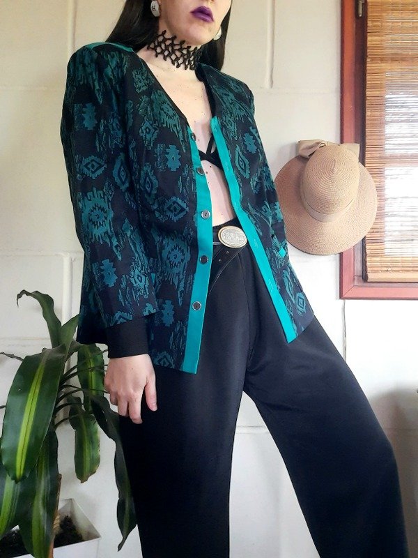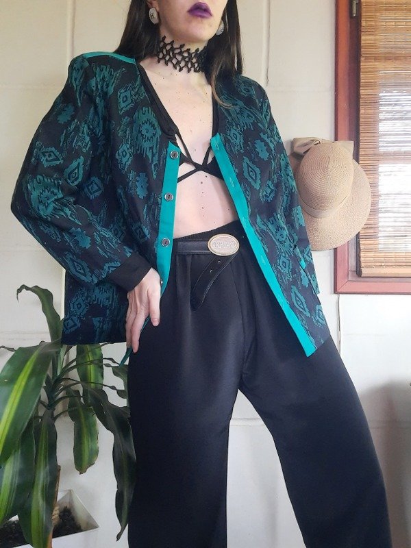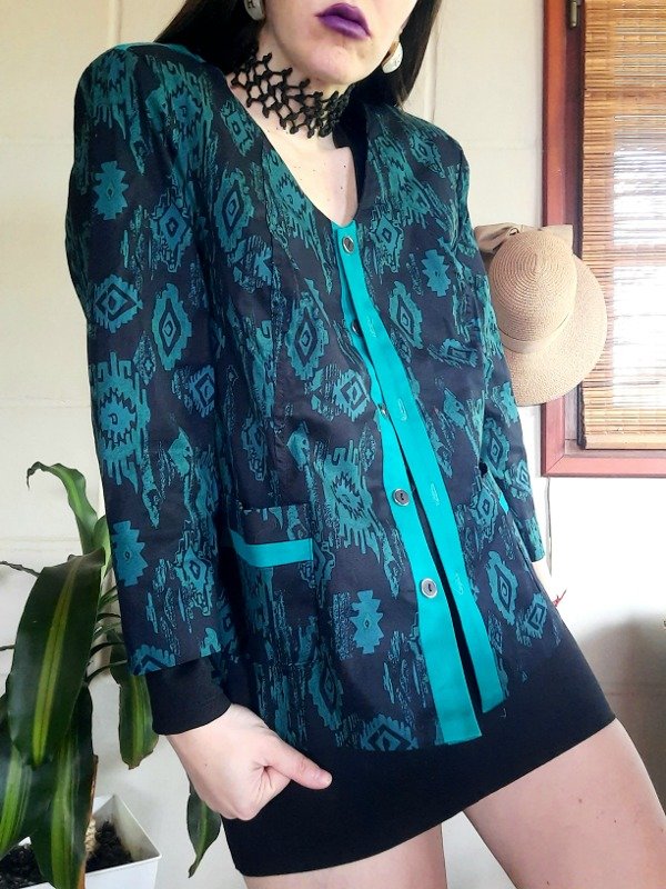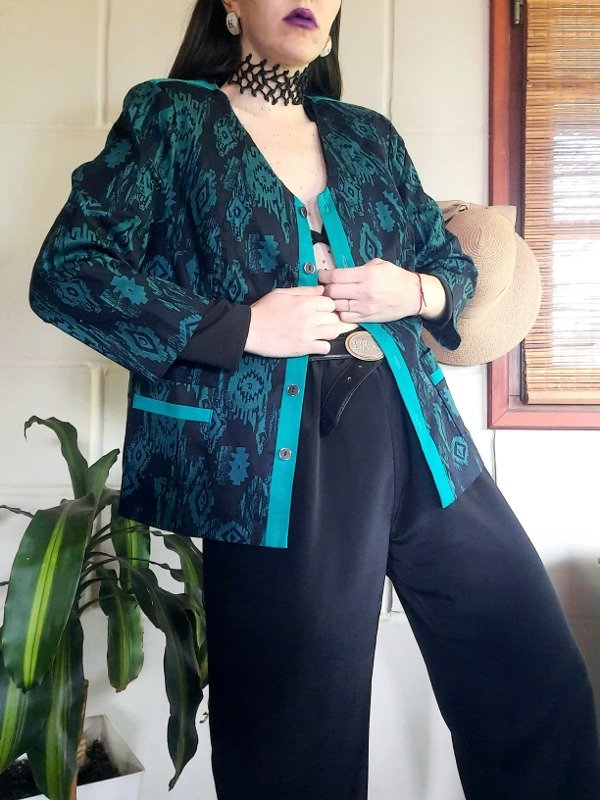 Saquito Green " Lady Tawil" es muy bello, de tela Liviana. Le da el toque a cualquier look. Con Bolsillos y botoncitos vintages. Talle M. Medidas: h a h 50 cm/ Sisa 48 cm/ Largo 60 cm. Excelente estado.